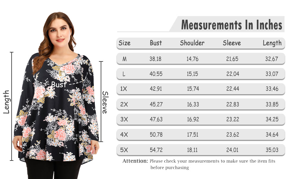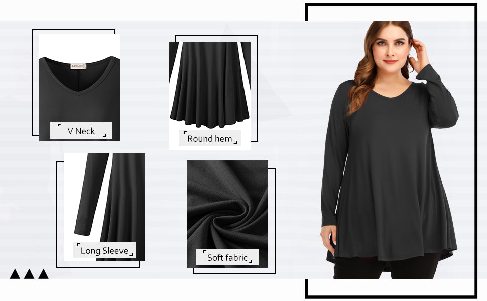 < V Neck Loose Fit Flowy Long Sleeve Tunics Tops Plus Size for Women - L LARACE V Neck Loose Fit Flowy Long Sleeve Tunics Tops Plus Size for Women - LARACE 8056                                                                                  Pull On closureLine DryPlus Size tunics for women, long sleeve, causal style with fashion V neck and button embellishedLoose fit, flowy, lightweight tunic tops for leggings for women, designed by LARACELong shirt is perfect for pairing with leggings or skinny jeans, and long enough to hide belly and hips.Plus size tunics for dating, Party, Evening, Casual, Travel, Home, Office, Vocation, Beach, maternity etc.Wash Instruction: Hand wash recommended; Machine wash cold / Do Not Bleach / Hang or Line Dry           Size GuideUS Size Reference: M/US 8-10,  L/US 12-14,  XL/US 16-18, 2XL/US 20-22,  3XL/US 24,  4XL/US 26, 5XL/US 28,  6XL/US 30Since the bust circumference and other data are different for each style of clothing, please measure carefully and compare our size chart. Our size chart is in inches.INSTRUCTION FROM LARACE DESIGNERPlease understand color may be slightly different due to monitor setting.Hand wash recommended. Machine wash cold / Do Not Bleach / Hang or Line Dry.If you can not make a choice for your size, offer your bust, waist and hips data to get recommendation. V Neck Loose Fit Flowy Long Sleeve Tunics Tops Plus Size for Women - LARACE 8056 | fashion loose fit design and flowy shape top