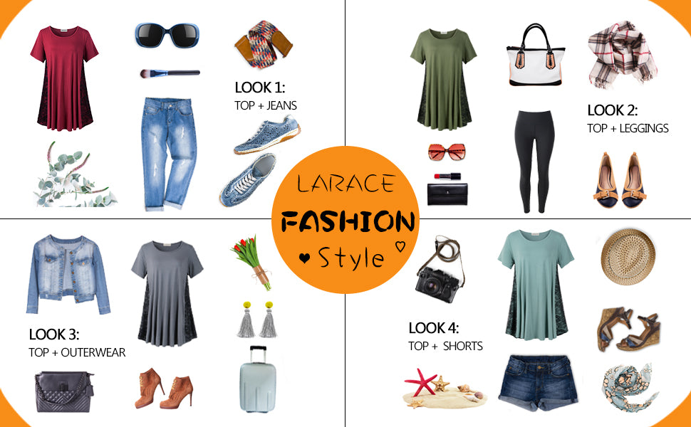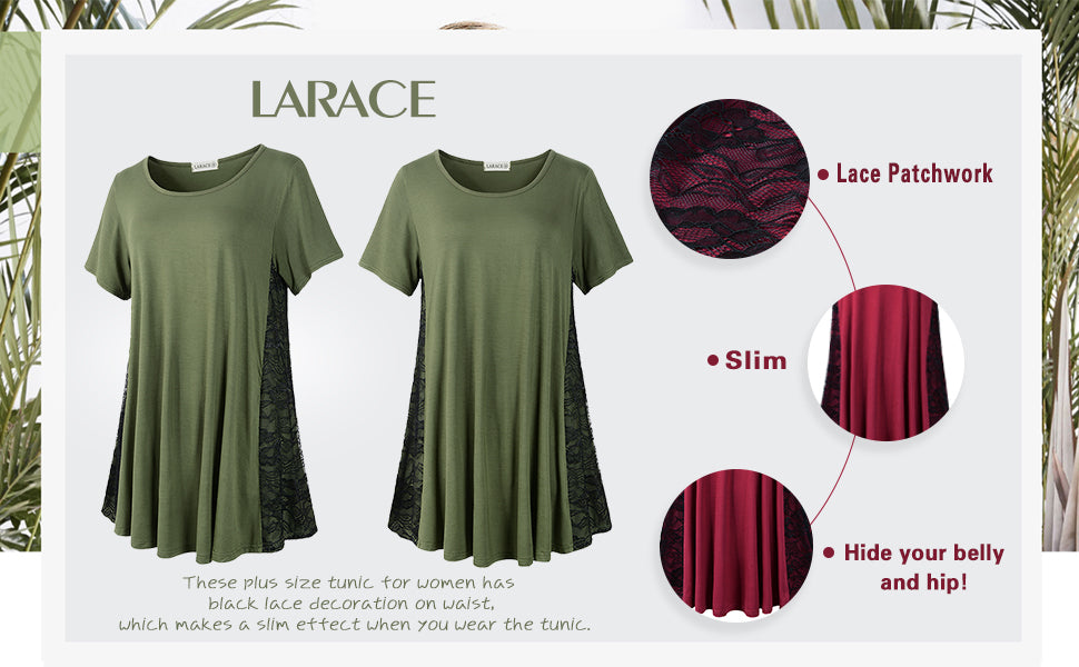 < Plus Size Women Lace Short Sleeve Flare T Shirt for Leggings-LARACE 80 LARACE Plus Size Women Lace Short Sleeve Flare T Shirt for Leggings-LARACE 8047 Product Specification:Soft and lightweight fabric-95% Rayon, 5% Spandex. Scoop Neck. Short Sleeves. Lace Patchwork.These plus size tunic for women has black lace decoration on waist, which makes a slim effect when you wear the tunic. Attention: Size of this style is (relatively) larger, so we recommend you choose a smaller size.These summer t shirts are must-have pieces with a comfort feeling and fashion design.Goes well with leggings or capris in summer. Easy to have a dressy look and good for home! Perfect top for dating, casual, travel, home, office, ocation, beach, maternity etc.Wash Instruction: Hand wash recommended; Machine wash cold / Do Not Bleach / Hang or Line Dry / Please refer to the washing lable inside.Size GuideUS Size Reference: M/US 8-10,  L/US 12-14,  XL/US 16-18, 2XL/US 20-22,  3XL/US 24,  4XL/US 26, 5XL/US 28,  6XL/US 30Since the bust circumference and other data are different for each style of clothing, please measure carefully and compare our size chart. Our size chart is in inches. INSTRUCTION FROM LARACE DESIGNERPlease understand color may be slightly different due to monitor setting.Hand wash recommended. Machine wash cold / Do Not Bleach / Hang or Line Dry.If you can not make a choice for your size, offer your bust, waist and hips data to get recommendation.  Plus Size Women Lace Short Sleeve Flare T Shirt for Leggings-LARACE 8047 | fashion loose fit design and flowy shape top