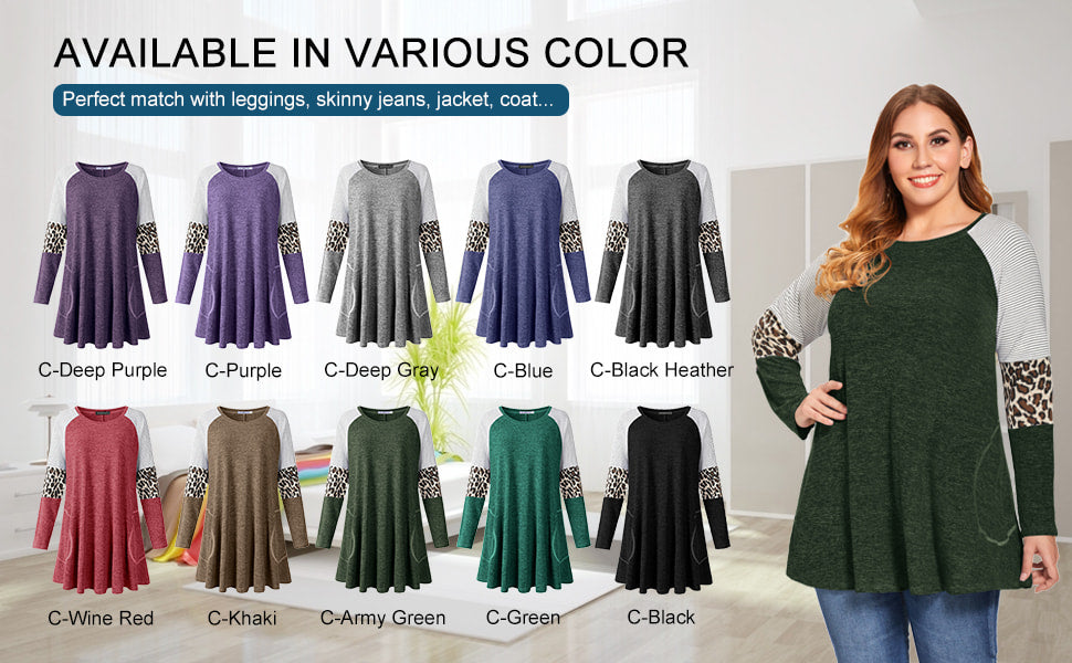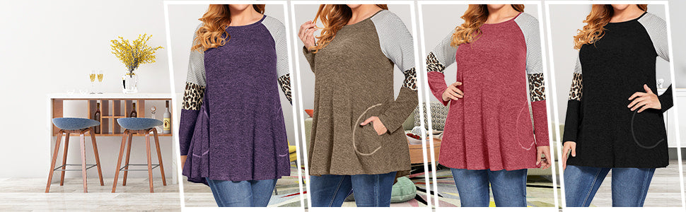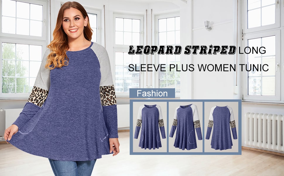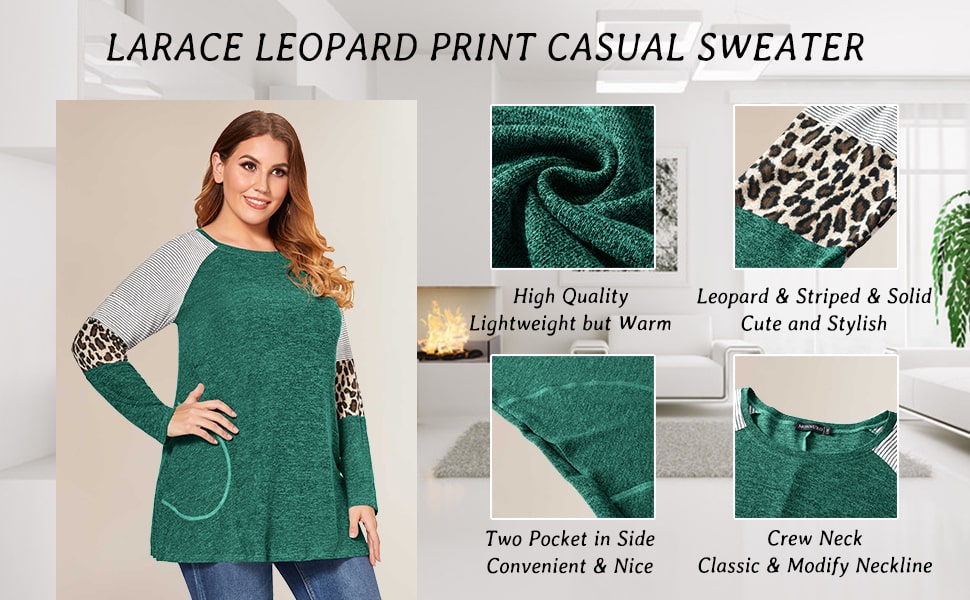 < LARACE Plus Size Leopard Long Sleeve Shirt with Pocket-8083 LARACE LARACE Plus Size Leopard Long Sleeve Shirt with Pocket-8083 Line DryStylish Long Sleeve Sweater for Women - Unique design long sleeve with leopard print, color block and classic striped patterm, loose sleeve cover fat on arms, pocket design covenience to put small items, all elements make a beatiful color contrastPlus Size Flare Swing Hemline -Extra long A shape hemline design tops, loose waist and relaxed, special for plus size women and maternity to hide the belly and bottom, create particular slimming effect for womenFits Various Occasion & Collocations - LARACE swing tunic tops for women plus size with pocket style suitable for Fall and Winter daily wear or dating, parties, travelling, family gathering. Perfect outfits with leggings, skinny jeans, jacket, cardigan, coat etcWash Instruction - DOT NOT BLEACH, hang or line dry, refer to the inside washing label. To keeping well shape for this color block long sleeve shirt, hand wash recommended or wash with wash bagSize GuideUS Size Reference: M/US 8-10,  L/US 12-14,  XL/US 16-18, 2XL/US 20-22,  3XL/US 24,  4XL/US 26, 5XL/US 28,  6XL/US 30Since the bust circumference and other data are different for each style of clothing, please measure carefully and compare our size chart. Our size chart is in inches.INSTRUCTION FROM LARACE DESIGNERPlease understand color may be slightly different due to monitor setting. Hand wash recommended. Machine wash cold / Do Not Bleach / Hang or Line Dry. If you can not make a choice for your size, offer your bust, waist and hips data to get recommendation.PRODUCT DETAILClosure Type: Pullover tshirt tops Material: 65% rayon +35% polyester + 5% spandex, extremely soft, warm and stretchy Wearing Occasion: Dating, Party, Evening, Casual, Travel, Home, Office, Vocation, Beach etc. Suitable for Who: Available for normal women, girls, maternity, plus size ladies, plus size petite ladies. Design: Long sleeve, crew neck, extra long, 'A' line swing loose, plus size, leopard print, color block, striped, side pockets Solid Color: C-Black, C-Black Heather, C-Wine Red, C-Purple, C-Khaki, C-Army Green, C-Green, C-Deep Purple, C-Deep Grey, C-BlueThe Focus Point From LARACE CustomersQuestion: What is the material?        Answer: Hi, This casual sweater is made of 65% Rayon +35% Polyester + 5% Spandex. Just like cashmere.Question: I have a big head, is the neck opening stretchy enough?        Answer: I believe it is big enough without really needing a stretch.Question: Hi, i'm 6'4' 170lb long arms What size might fit me best?        Answer: I'm 5' 4'' 165LB I ordered XXL, I like a big loose shirt. Try the next size up it will probably fit you.Question: Is the size chart in this sweater picture accurate?        Answer: I bought it according to the size in the buyer's picture. It is very suitable in size and comfortable to wear.Question: Is this sweatshirt warm?         Answer: I think that depends on where you live. It is lightweight but comfortably warm, if its cool at night or in the evenings, its great!Question: How long does this sweatshirt usually deliver?         Answer: I received this cute sweatshirt for only 2-3 days and arrived soon.Question: is this item washable?         Answer: yes, the seller recommended me hand wash or machine wash in a wash bag. LARACE Plus Size Leopard Long Sleeve Shirt with Pocket-8083 | fashion loose fit design and flowy shape top